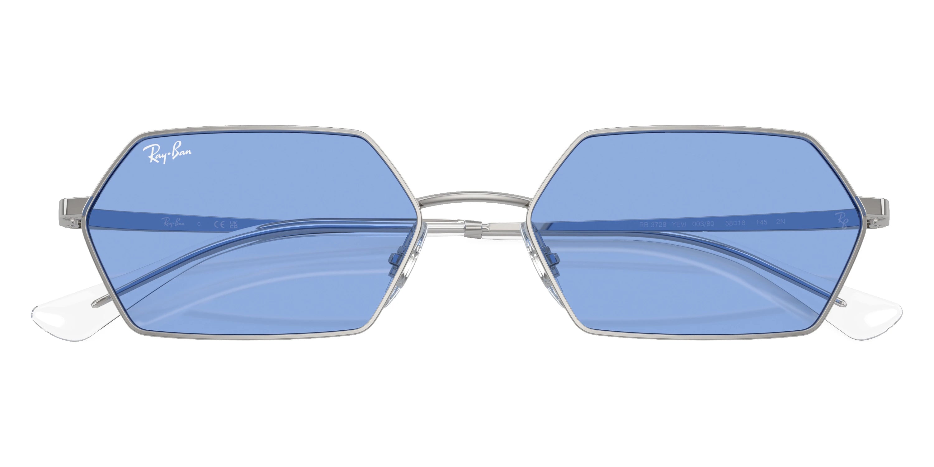 Silver (003/80) Sunglasses with Blue lenses (Yevi RB3728 003/80 58) by Ray-Ban®. Size: 58-18-145, Shape: Irregular, Material: Metal.
