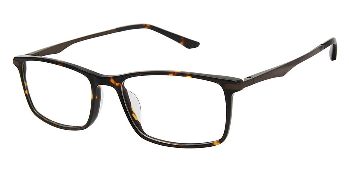 Tortoise (c02) Eyeglasses (NU073 c02 52) by TLG™. Size: 52-17-140, Shape: Rectangle, Material: Plastic and Titanium.