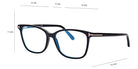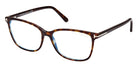 Shiny Dark Havana/T Logo (052) Eyeglasses with Blue Block lenses (FT5842-B 052 54) by Tom Ford™. Size: 54-15-140, Shape: Square, Material: Plastic.