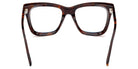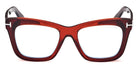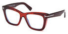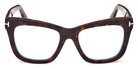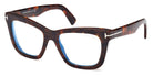 Shiny Dark Havana/T Logo (052) Eyeglasses with Blue Block lenses (FT5881-B 052 52) by Tom Ford™. Size: 52-19-135, Shape: Square, Material: Plastic.