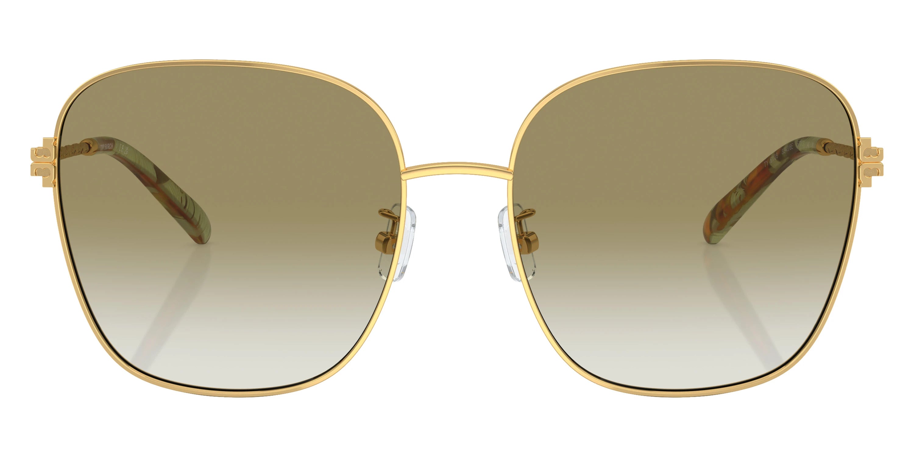 Gold (33438E) Sunglasses with Clear Gradient Dark Green lenses (TY6108 33438E 57) by Tory Burch™. Size: 57-17-140, Shape: Square, Material: Metal.