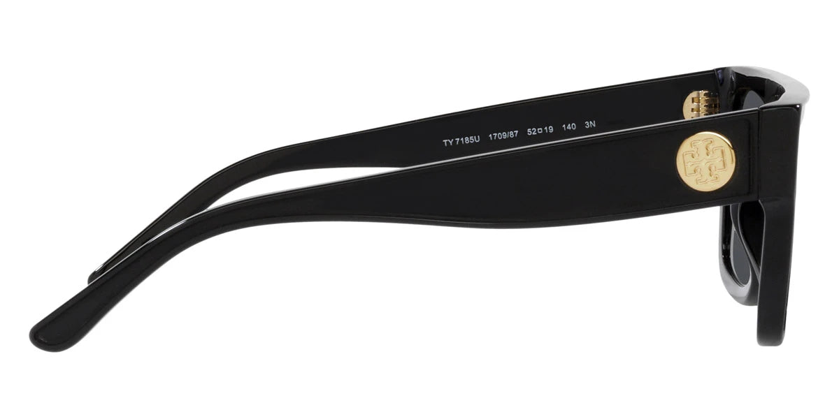 Black (170987) Sunglasses with Solid Gray lenses (TY7185U 170987 52) by Tory Burch™. Size: 52-19-140, Shape: Rectangle, Material: Plastic.