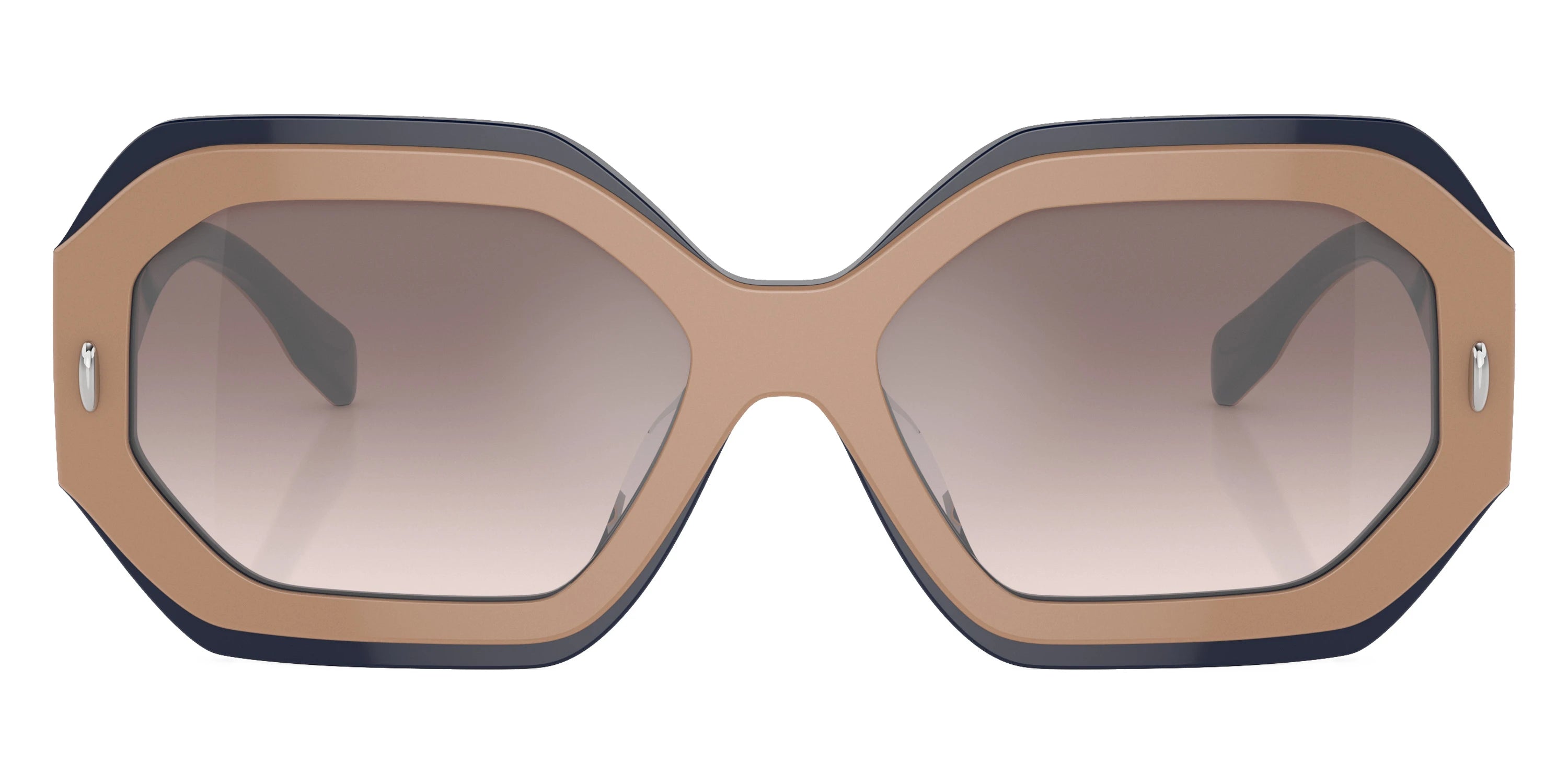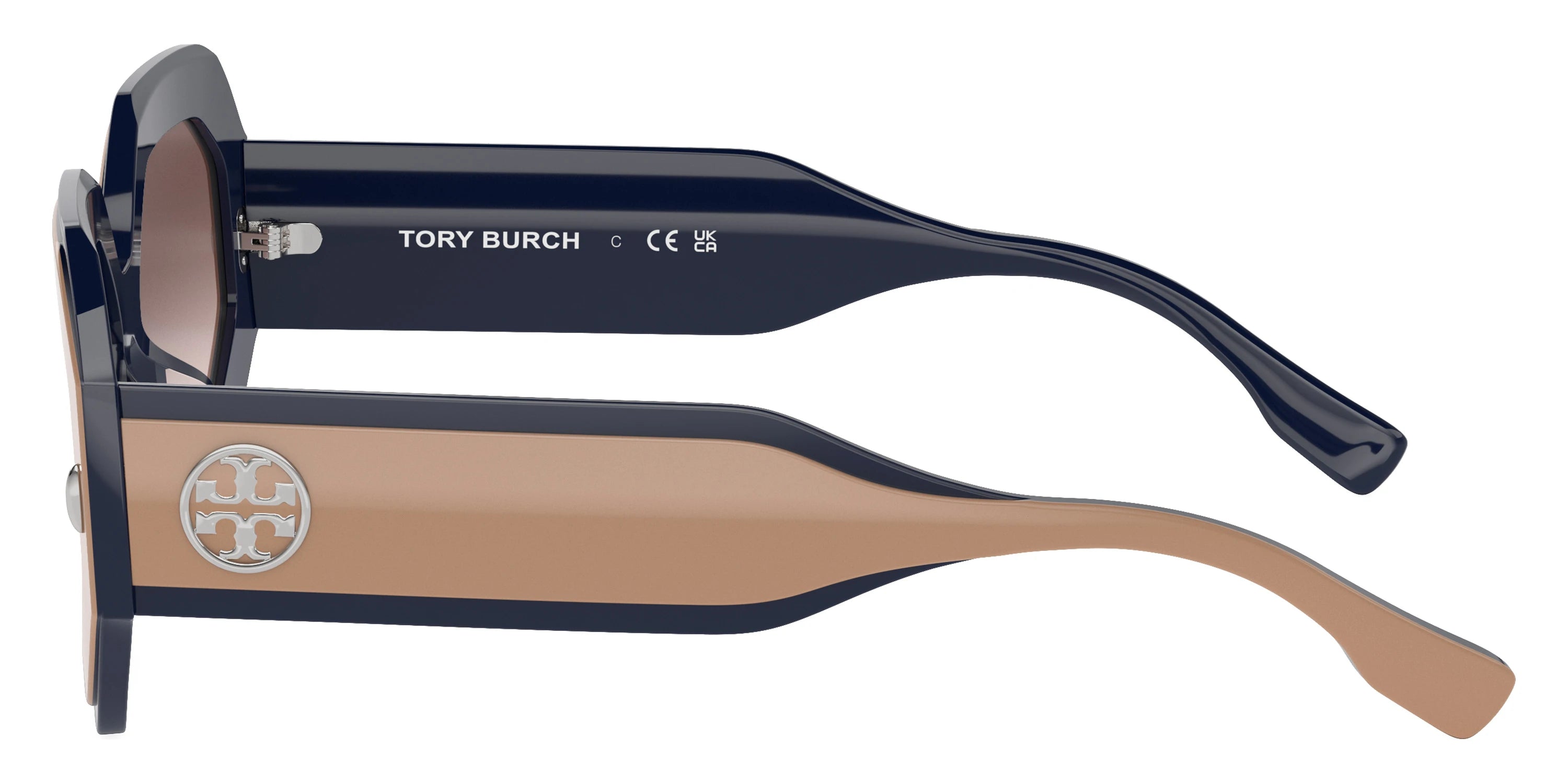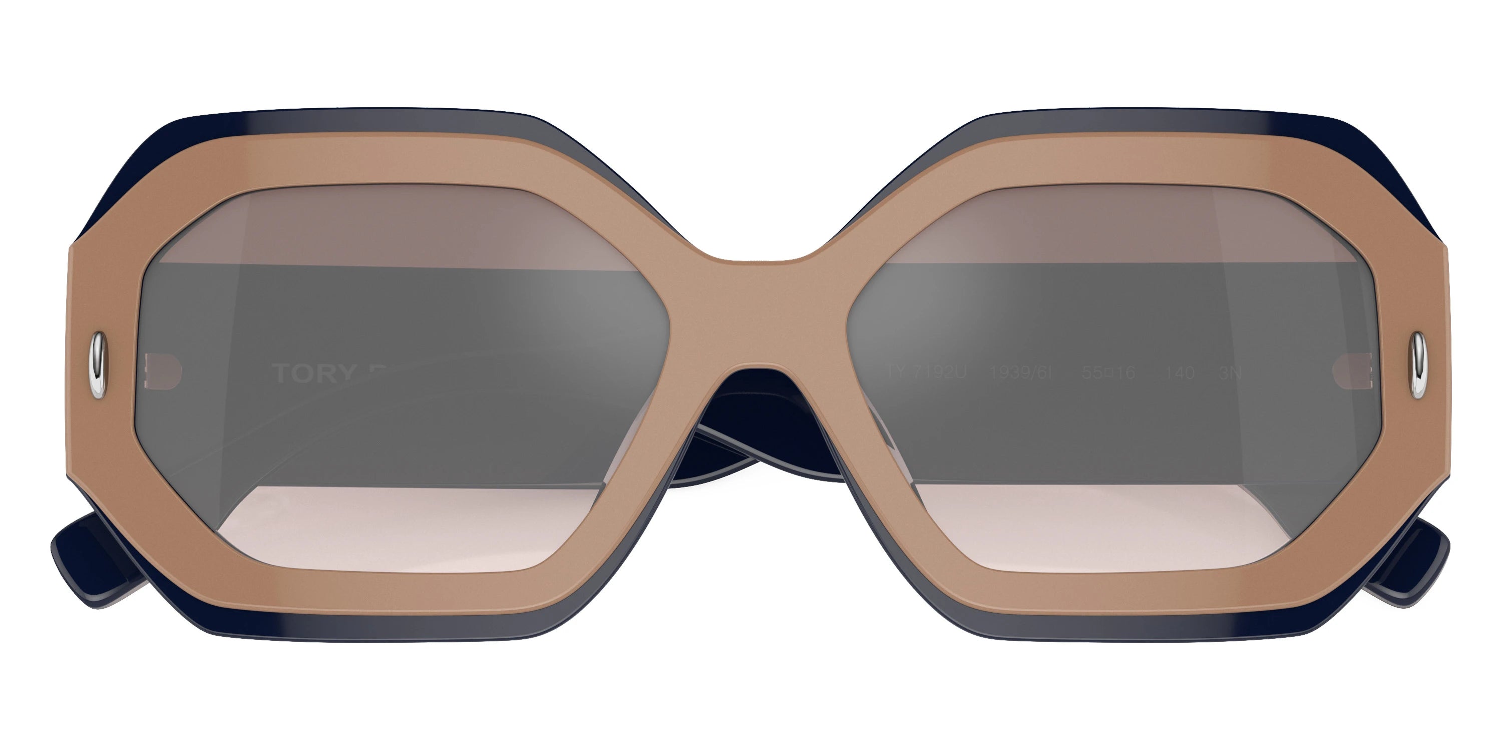 Navy/Beige (19396I) Sunglasses with Clear Gradient Gray Mirrored Silver lenses (Miller TY7192U 19396I 55) by Tory Burch™. Size: 55-16-140, Shape: Irregular, Material: Acetate.