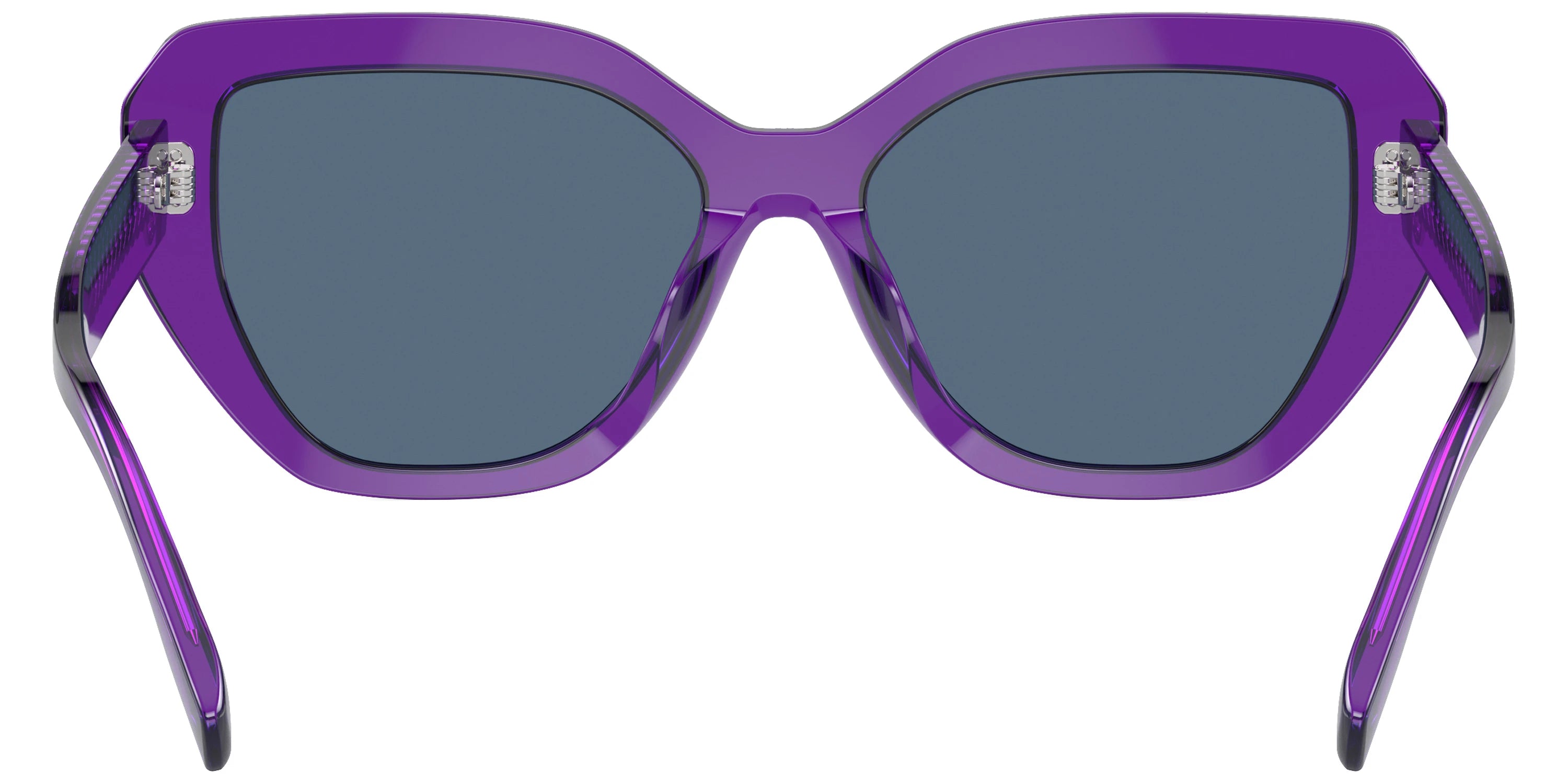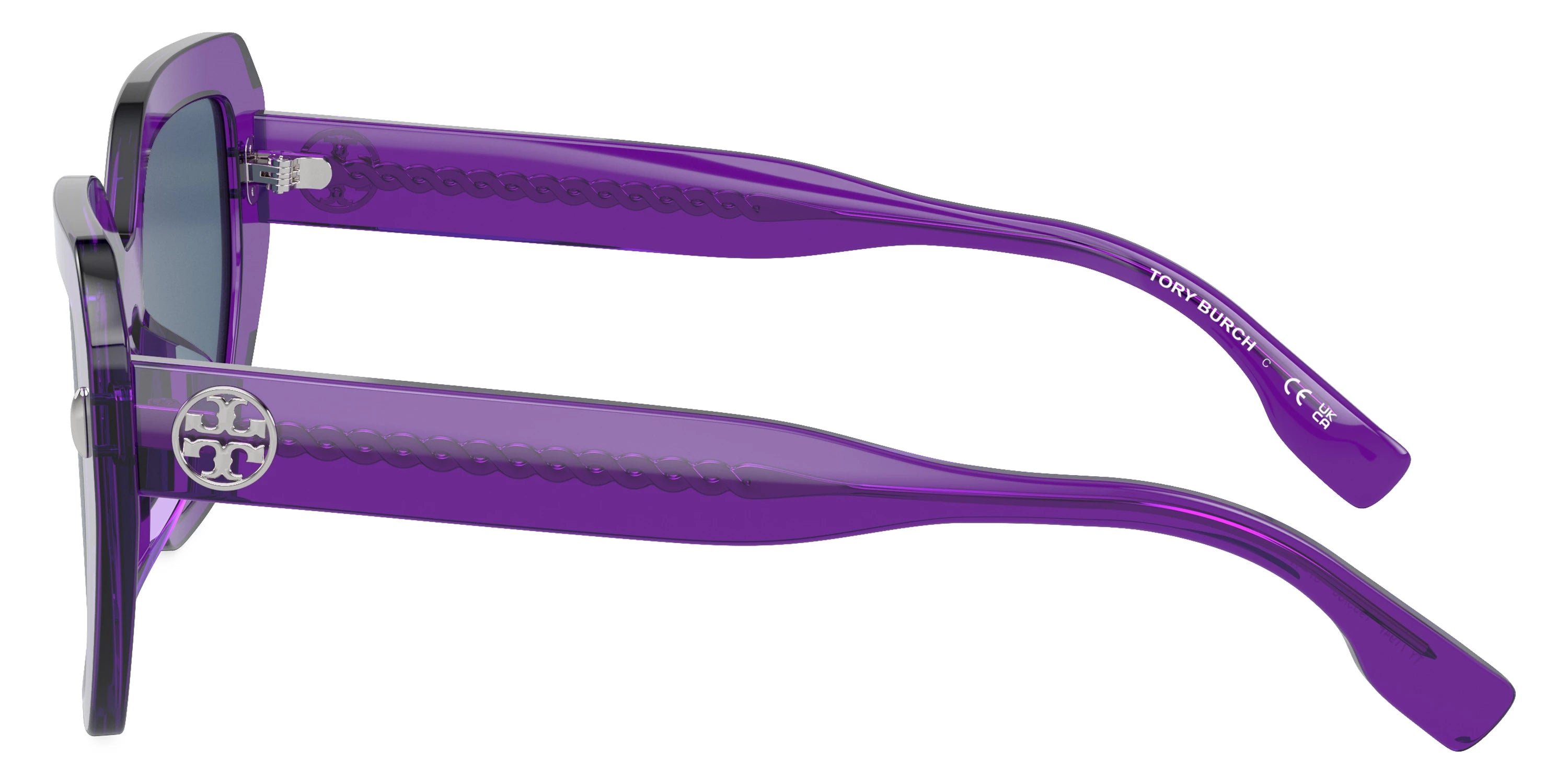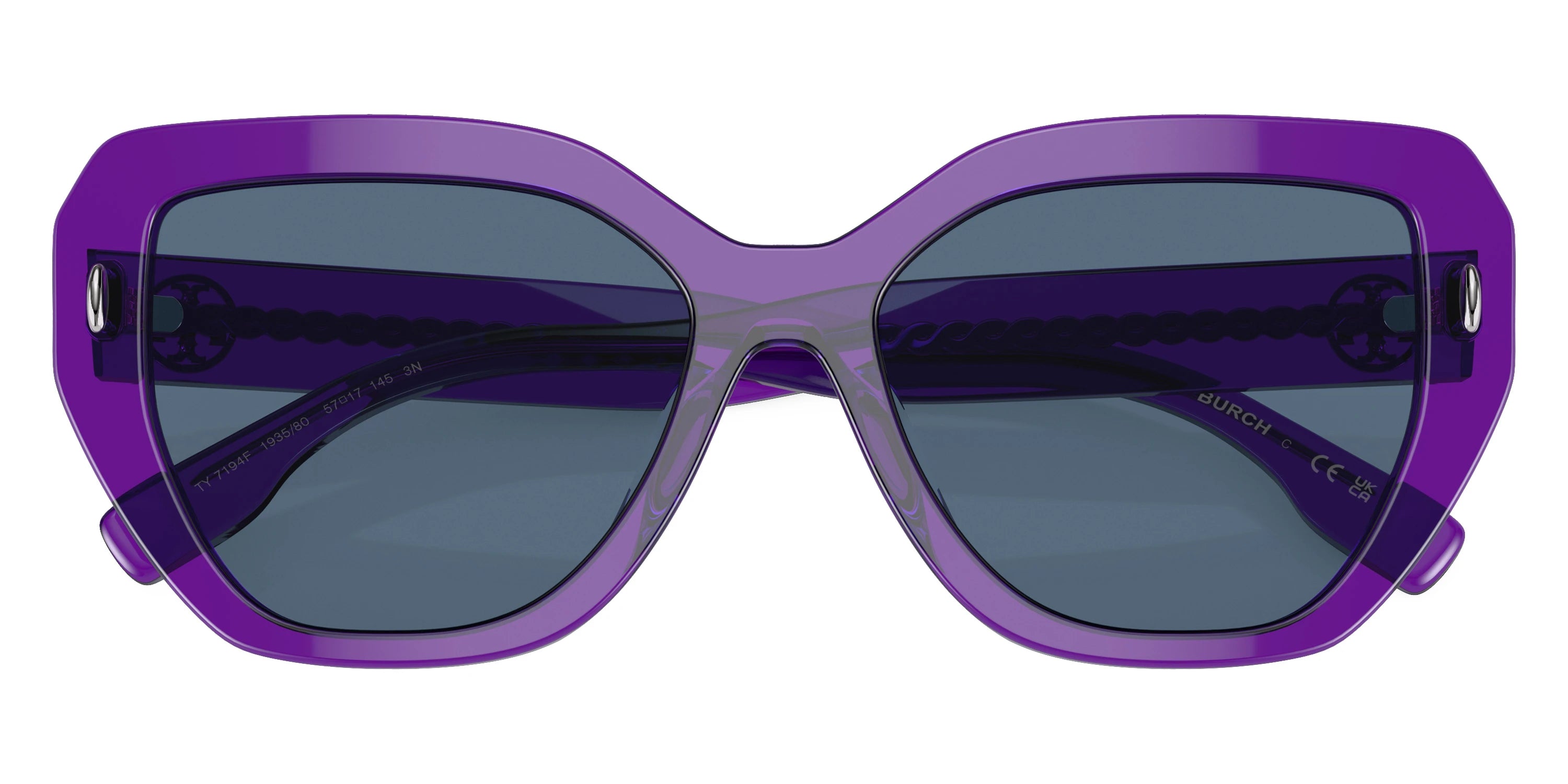 Transparent Purple (193580) Sunglasses with Dark Blue lenses (TY7194F 193580 57) by Tory Burch™. Size: 57-17-145, Shape: Cat-Eye, Material: Acetate.