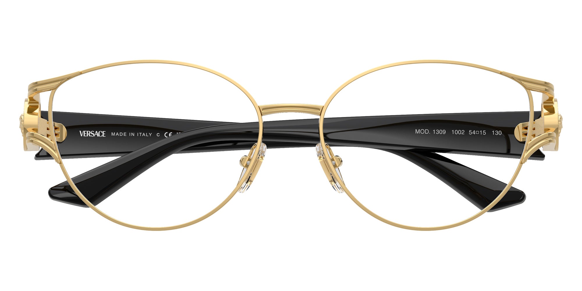 Gold (1002) Eyeglasses (VE1309 1002 52) by Versace. Size: 52-15-130, Shape: Cat-Eye, Material: Metal and Injected.