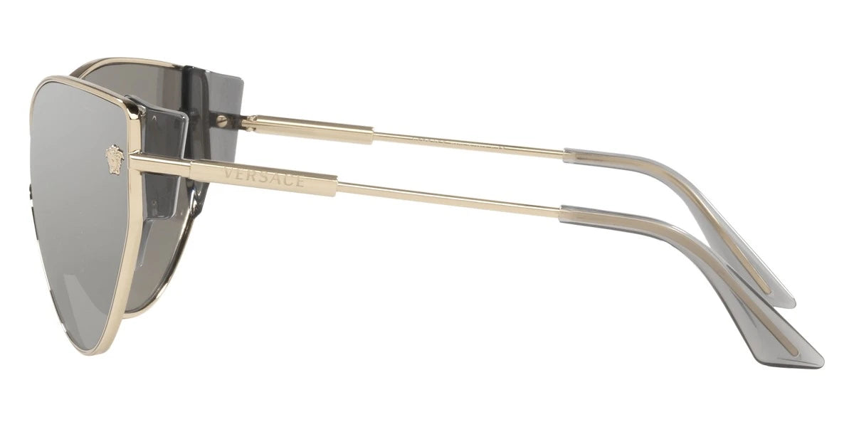 Pale Gold (12526G) Sunglasses with Light Gray Mirrored Silver lenses (VE2239 12526G 47) by VERSACE™. Size: 147-0-135, Shape: Cat-Eye, Material: Metal.