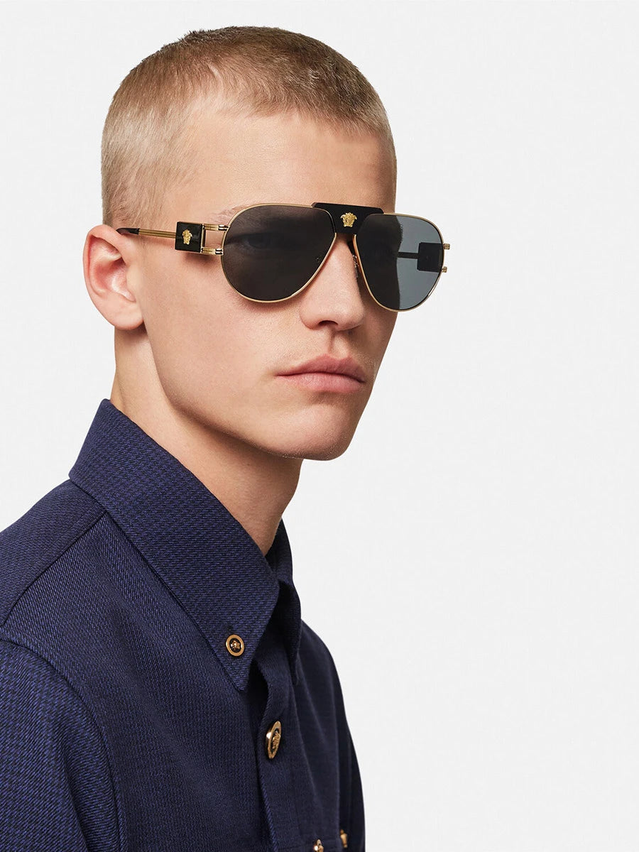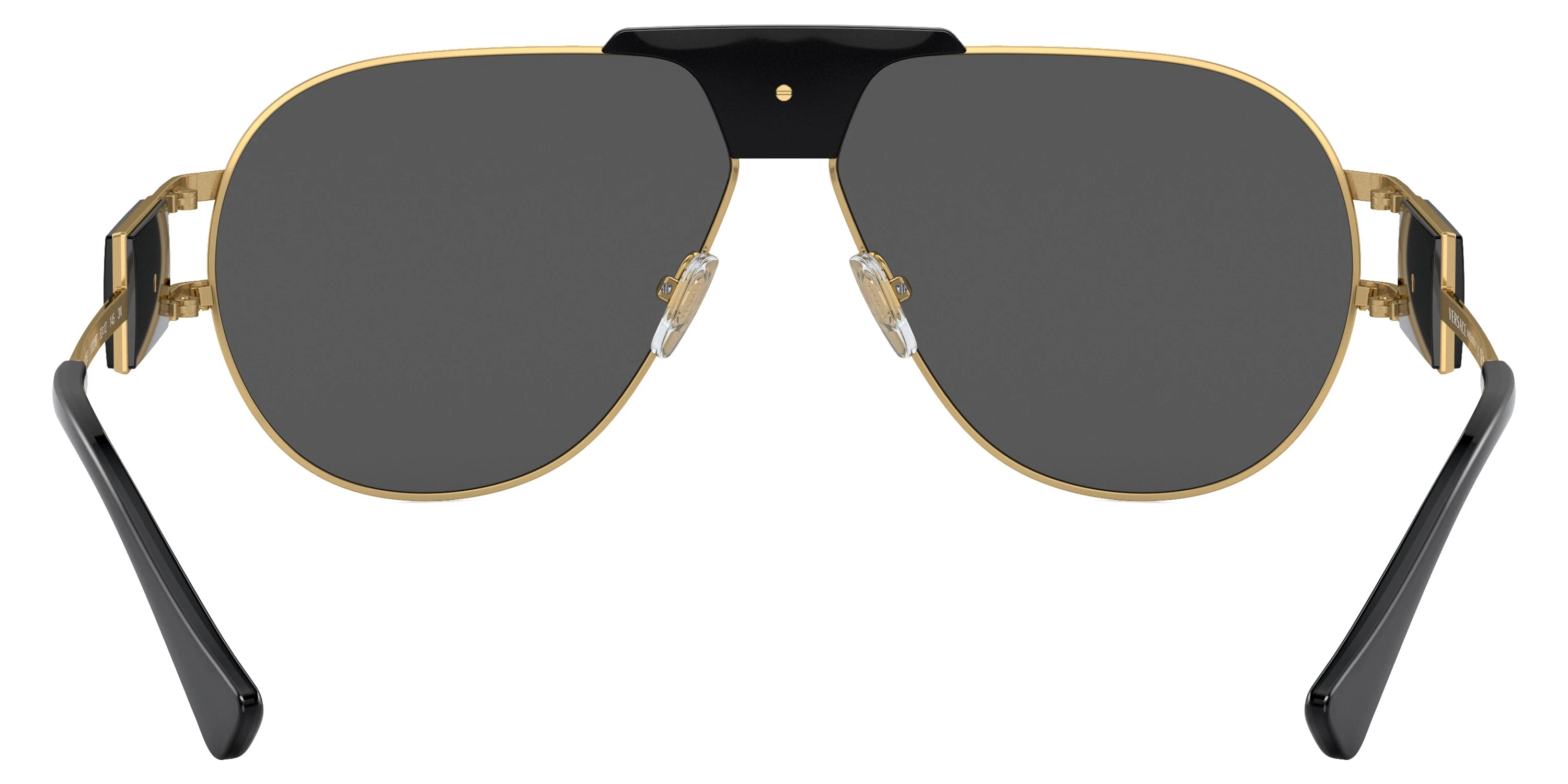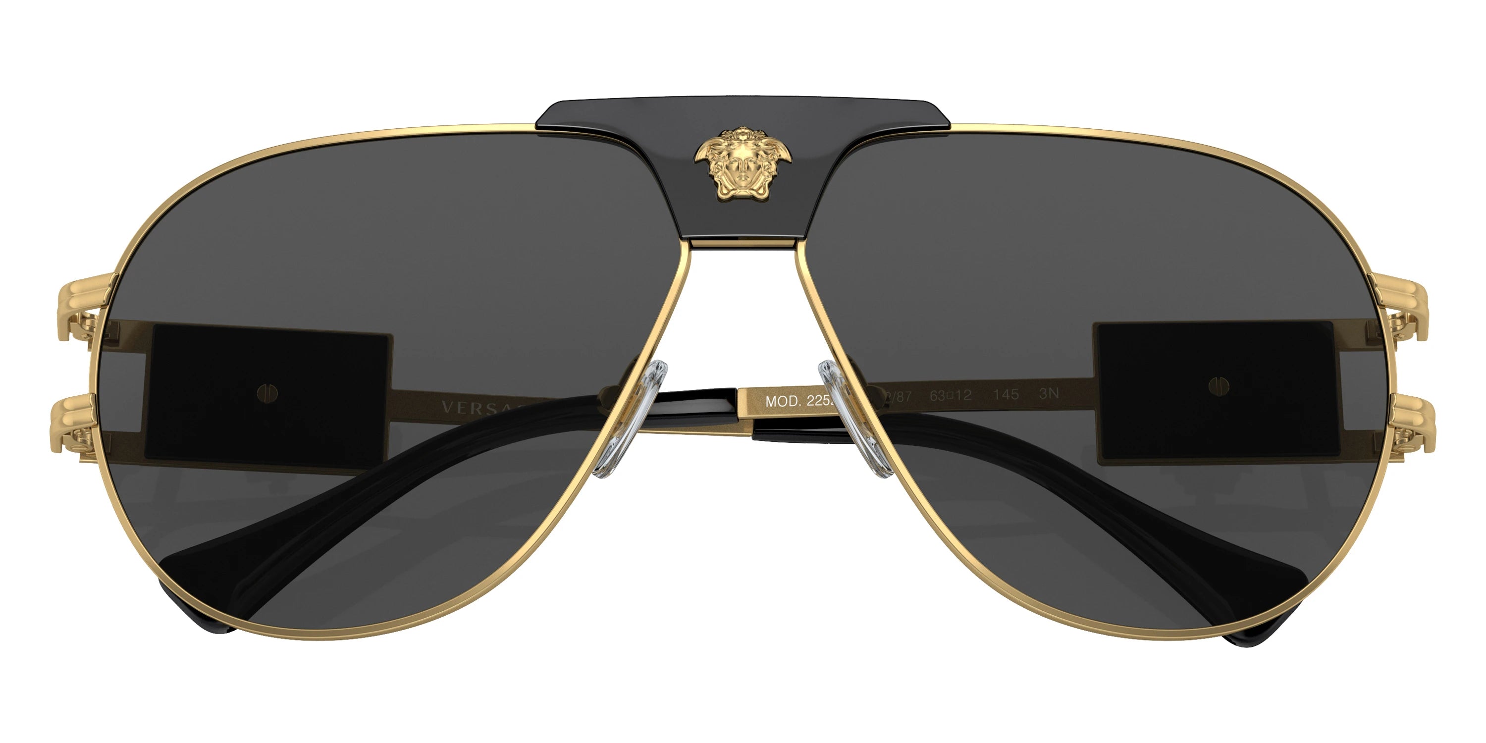 Gold (100287) Sunglasses with Dark Gray lenses (VE2252 100287 63) by VERSACE™. Size: 63-12-145, Shape: Aviator, Material: Steel and Metal.