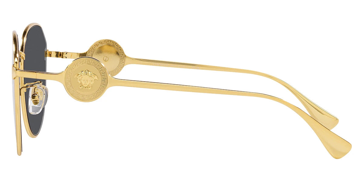 Gold (100287) Sunglasses with Dark Gray lenses (VE2259D 100287 58) by VERSACE™. Size: 58-17-140, Shape: Irregular, Material: Steel.