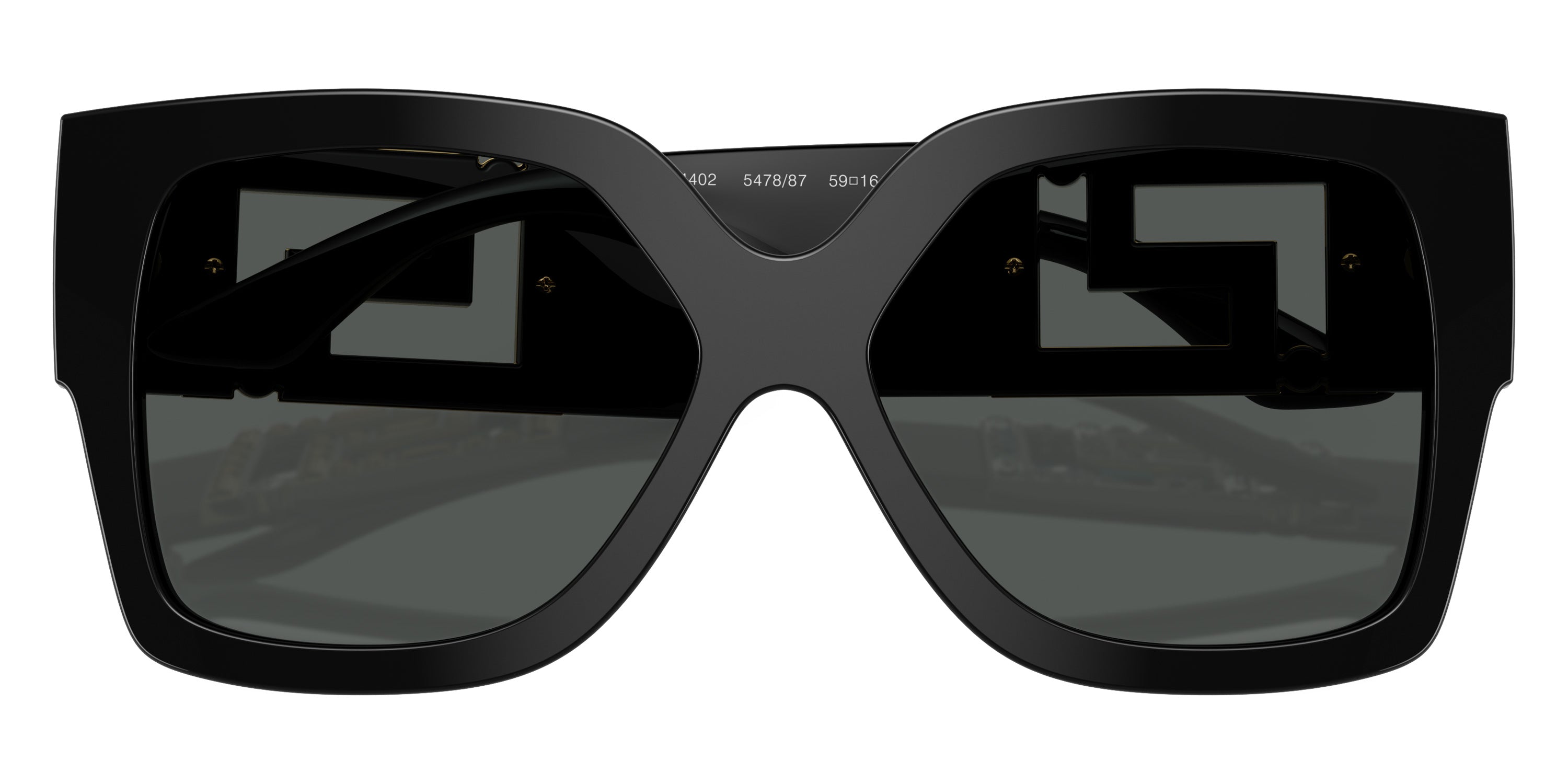 Black (547887) Sunglasses with Dark Gray lenses (Greca VE4402 547887 59) by VERSACE™. Size: 59-16-140, Shape: Rectangle, Material: Acetate and Nylon.