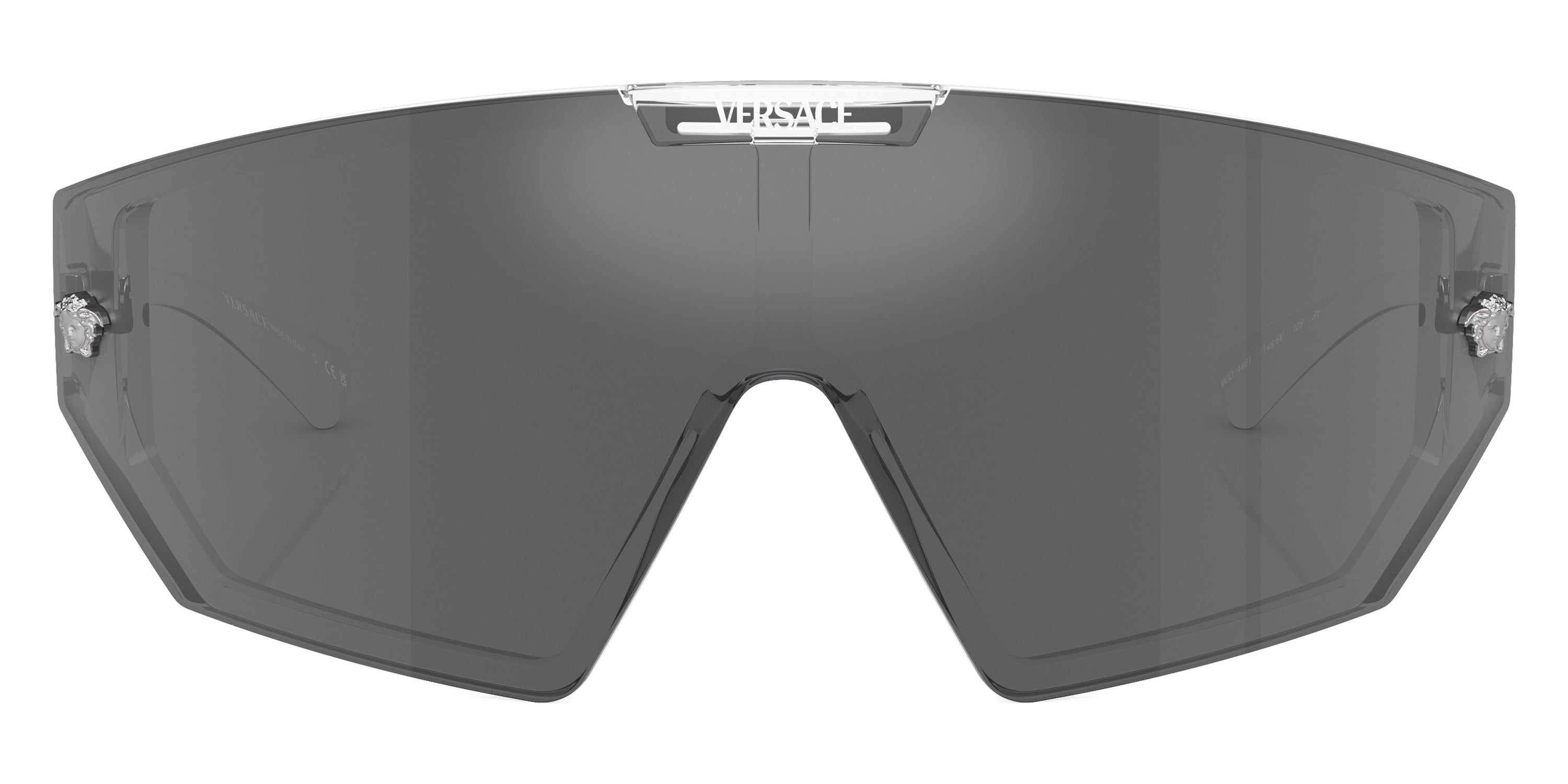 Crystal (148/6V) Sunglasses with Gray Mirrored Black/Mirrored Blue Violet lenses (VE4461 148/6V 147) by VERSACE™. Size: 147-0-125, Shape: Irregular, Material: Injected.
